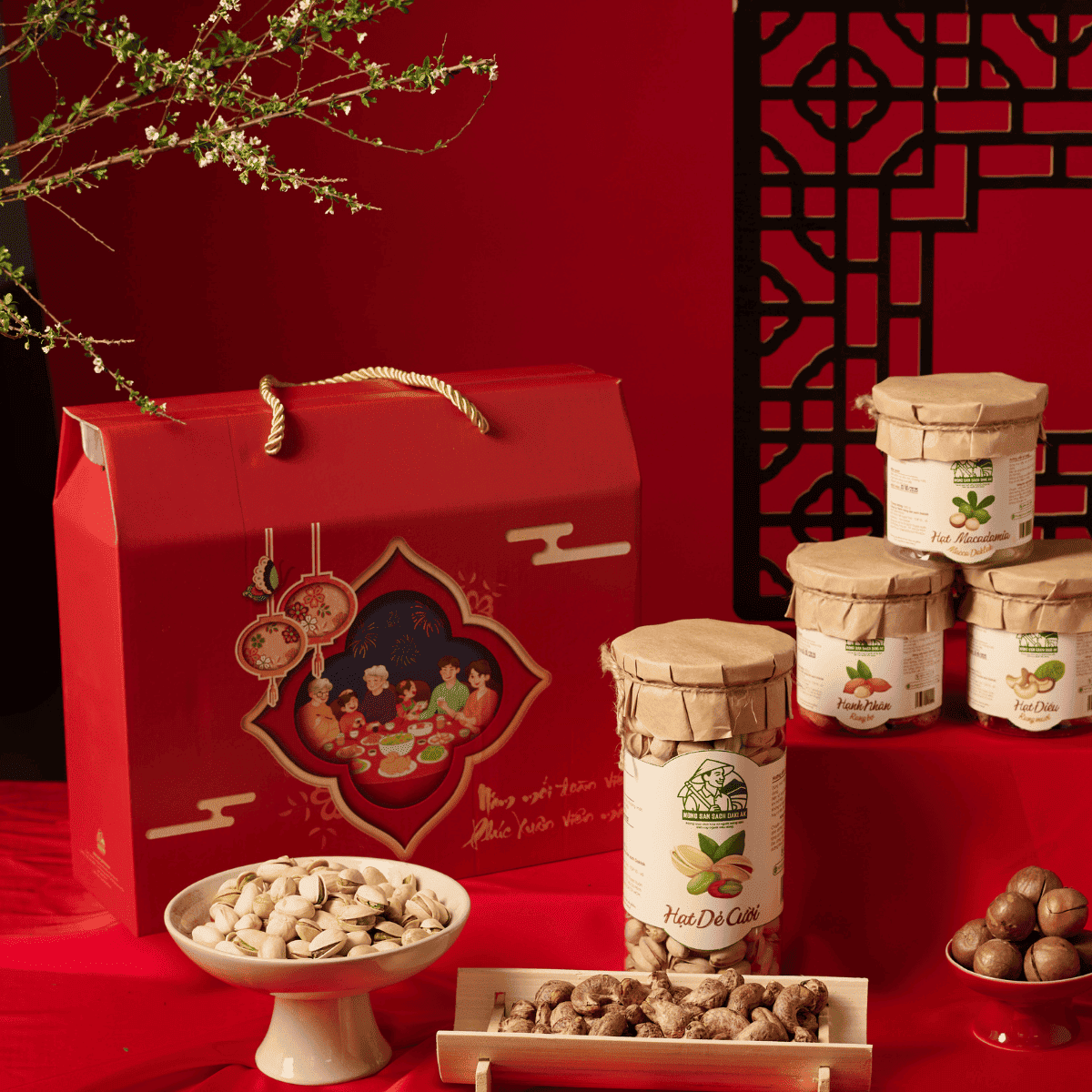 Phúc Xuân Viên Mãn – set quà Tết 2026 mang đậm ý nghĩa sum vầy – đoàn viên – trọn vẹn hạnh phúc, được thiết kế dành riêng cho những mối quan hệ mà bạn trân quý. Lấy cảm hứng từ hình ảnh mâm cơm ngày đầu năm của gia đình Việt, hộp quà gợi lại khoảnh khắc ba thế hệ quây quần, cùng gửi nhau lời chúc bình an và viên mãn. Toàn bộ thiết kế mang tông đỏ may mắn, kết hợp họa tiết đèn lồng – hoa mai – pháo hoa được xử lý tinh tế, tạo nên tổng thể ấm áp và sang trọng, đúng chuẩn quà Tết cao cấp 2026.
